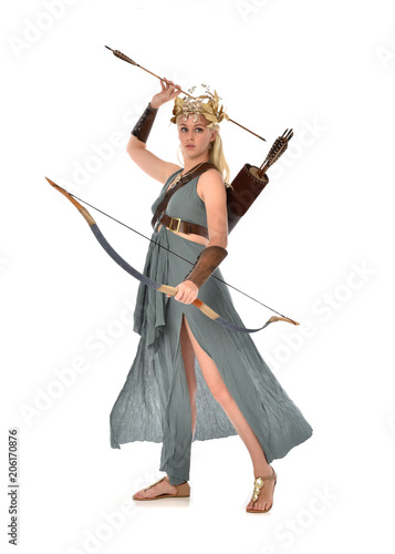 Full Length Portrait Of Pretty Blonde Lady Wearing Fantasy Toga Gown And Holding A Bow And Arrow Standing Pose On White Background Buy This Stock Photo And Explore Similar Images At